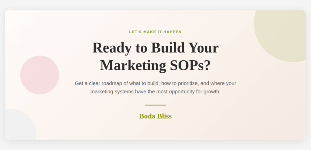 However, here’s the thing: knowing you need effective SOPs and actually building them are two different things. If you’re not sure where to start or which marketing processes to document first, I can help.